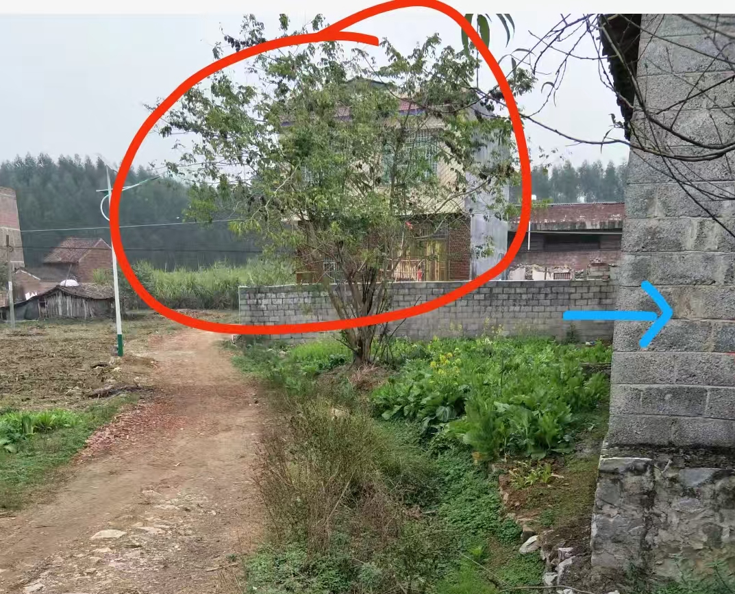 红色圈为凶手家,蓝色箭头为被害人家。 受访者供图