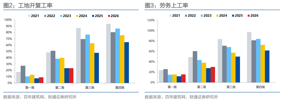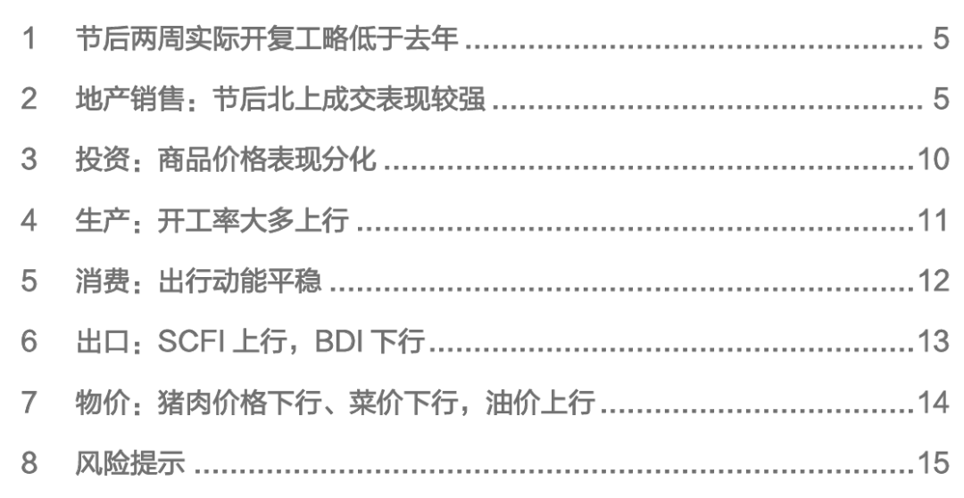 结合样本量变化和春节假期靠后因素,我们判断,今年前两周开复工的实际情况或略低于去年,后续还需要观察能否加速修复。