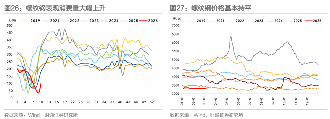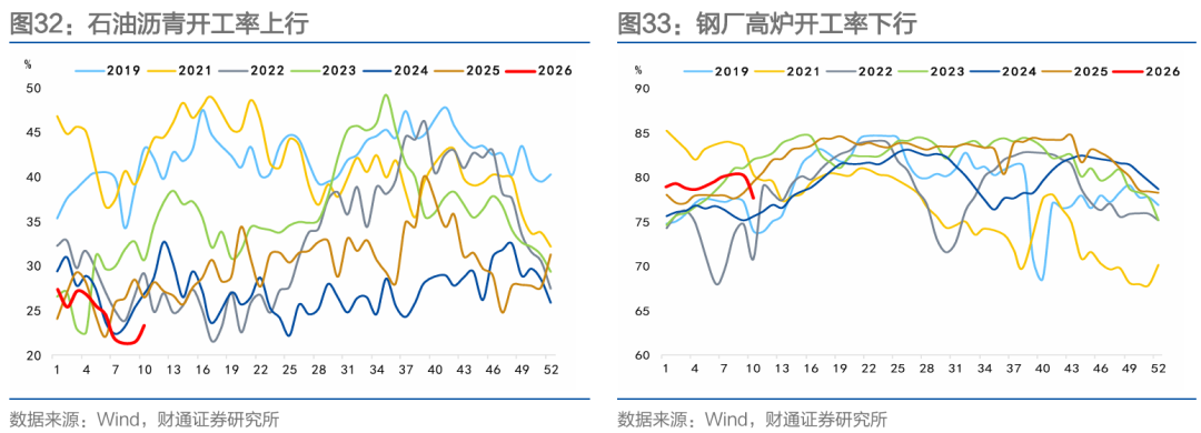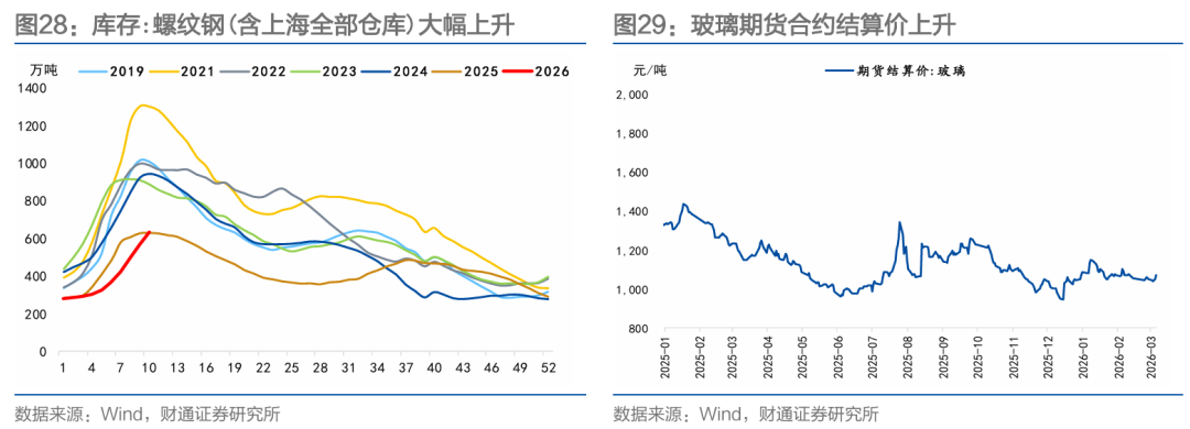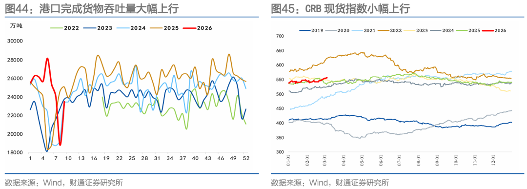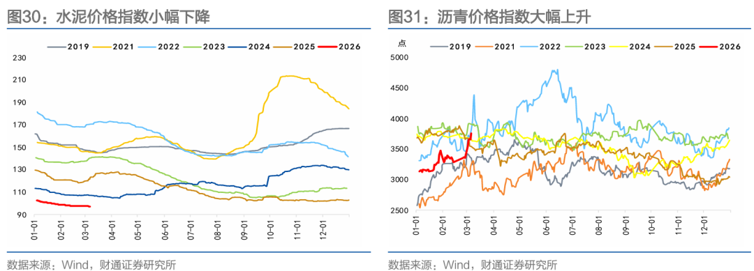 投资生产方面,商品价格表现分化。螺纹钢价格基本持平,需求边际回暖,库存累积;水泥价格小幅下降,节后稳步恢复,需求温和回升;玻璃期货价格上升,库存长假后累库;沥青价格大幅上升,主要受成本端支撑。