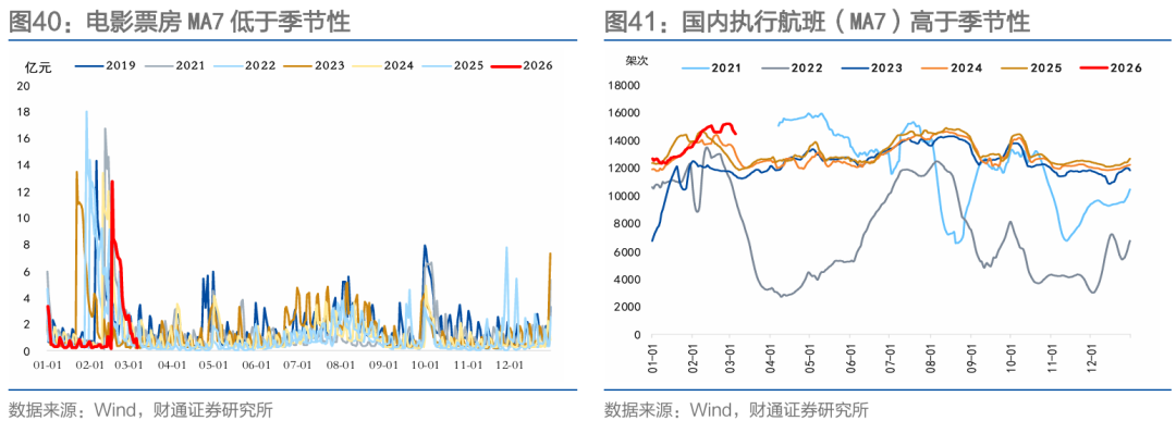 消费方面,出行动能有所减弱。地铁出行符合季节性,国内执行航班高于季节性,汽车销售、电影票房低于季节性。