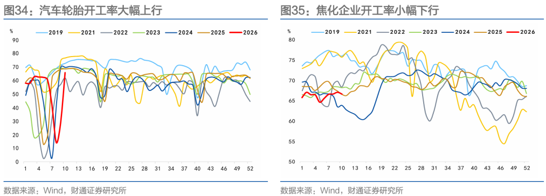 工业生产方面,开工率大多上行。石油沥青开工率、涤纶长丝开工率、PTA开工率上行,汽车轮胎开工率大幅上行,钢厂高炉开工率下行,焦化企业开工率小幅下行。