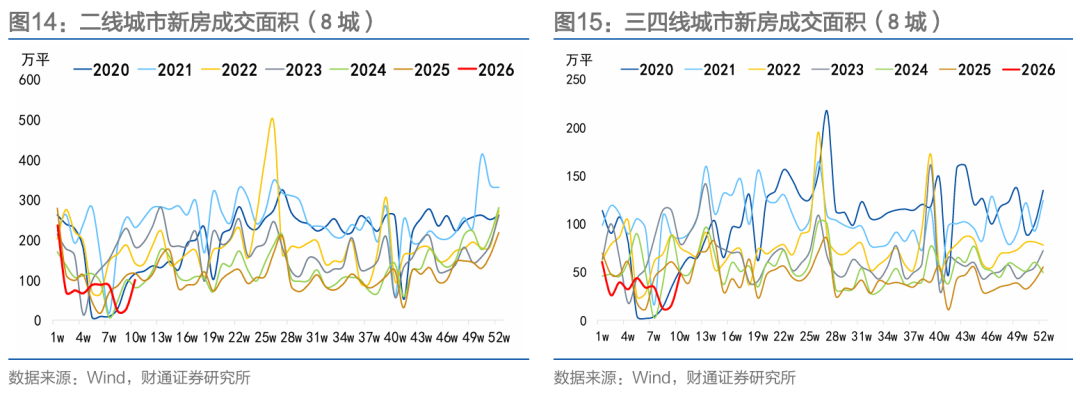 环比来看,节后第二周开复工率环比上行14.6%,低于去年的16%;劳务上工率环比上行14.2%,低于去年的15.7%。