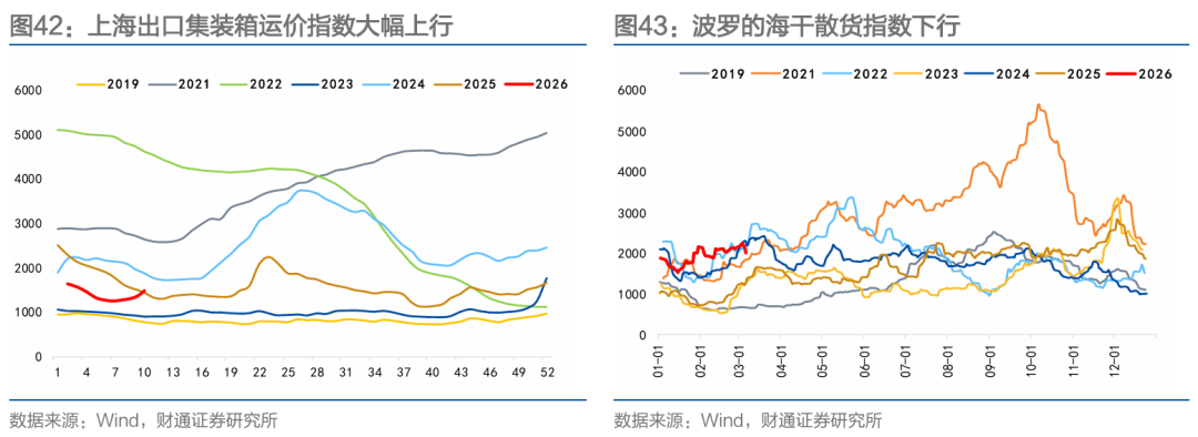 出口方面,本周SCFI上行,BDI下行。本周北美航线,运输需求偏弱,市场运价继续上行。
