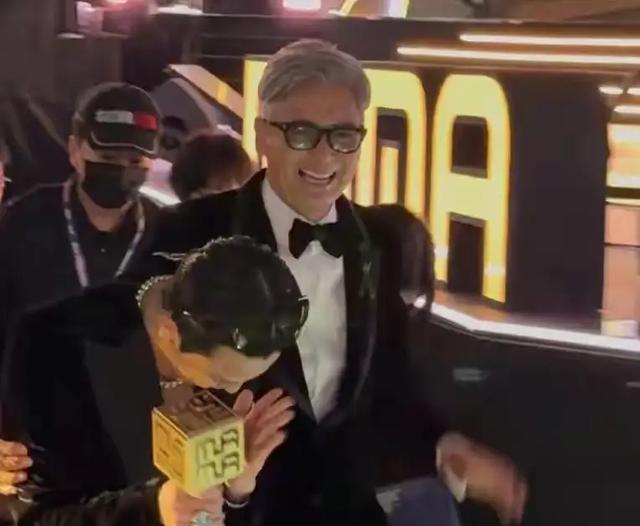 可这份感动没撑过十分钟,轮到他给权志龙颁“年度艺人”时画风突变,拉着权志龙的手不放,跟着音乐扭胯跳舞,脸上的笑容藏都藏不住。