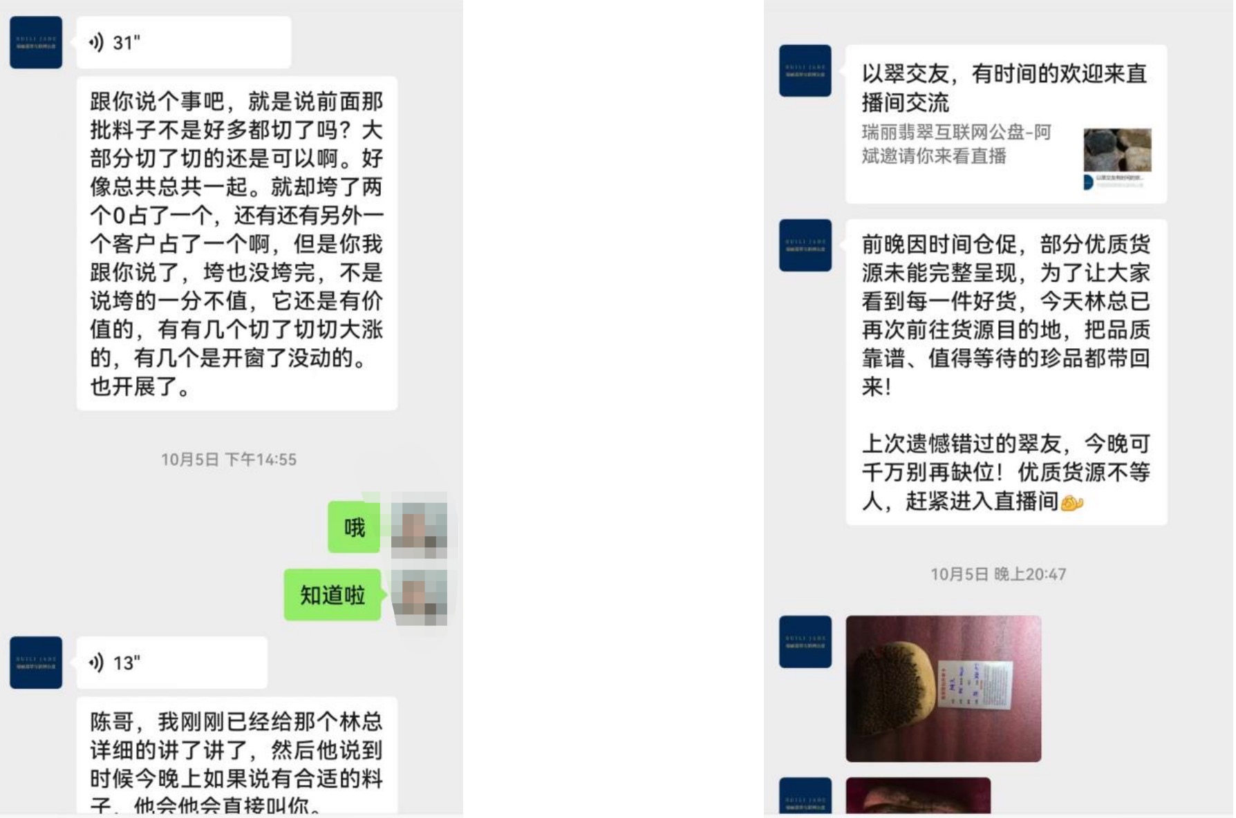 记者发现,客服人员发给邓发的直播间,都不是常见的社交平台链接,直播结束后无法查看内容。邓发提供的部分直播录屏中,主播不断用夸张的语气描述手中原石的优质,网友则纷纷留言求购,营造哄抢氛围。其中一条直播中,主播还邀请两名自称从缅甸来的货主,双方在直播间一唱一和,称赞原石的品相。