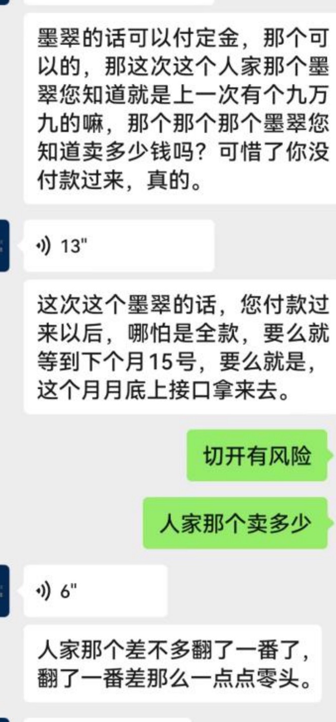 “第一块切坏的,说是值300元。另一块切坏的,说是值3000元。如果我要钱就转给我,如果我要石头,就把石头寄给我。”邓发说,他累计花了近20万元,其中有一笔5万余元,是参与竞拍某块原石的定金,因为接连切失败,他放弃了竞拍。